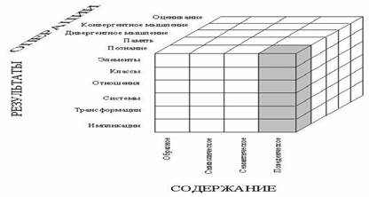 Таким образом, классификационная схема Д. Гилфорда описывает 120 интеллектуальных факторов (способностей): 5 х 4 х 6 = 120. Каждой интеллектуальной способности соответствует маленький кубик, образованный тремя осями координат: содержание, операции, результаты Рисунок 2).