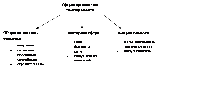 Три сферы проявления темперамента: общая активность, особенности моторной сферы и свойства эмоциональности. Общая активность определяется интенсивностью и объемом взаимодействия человека с окружающей средой – физической и социальной. По этому параметру человек может быть инертным, пассивным, спокойным, инициативным, активным, стремительным. Проявление темперамента в моторной сфере можно рассматривать как частные выражения общей активности. К ним относятся темп, быстрота, ритм и общее количество движений. Когда говорят об эмоциональности как проявлении темперамента, то имеют в виду впечатлительность, чувствительность, импульсивность и т.п. [24].