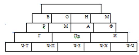 В отечественной психологии наибольшую известность получила классификация профессий, разработанная Е.А. Климовым. Схематично эту классификацию можно представить в виде пирамиды из четырех ярусов: типы профессий, классы профессий, отделы профессий. Пустой прямоугольник на вершине предназначен для обозначения будущей профессии человека [11, с.37].